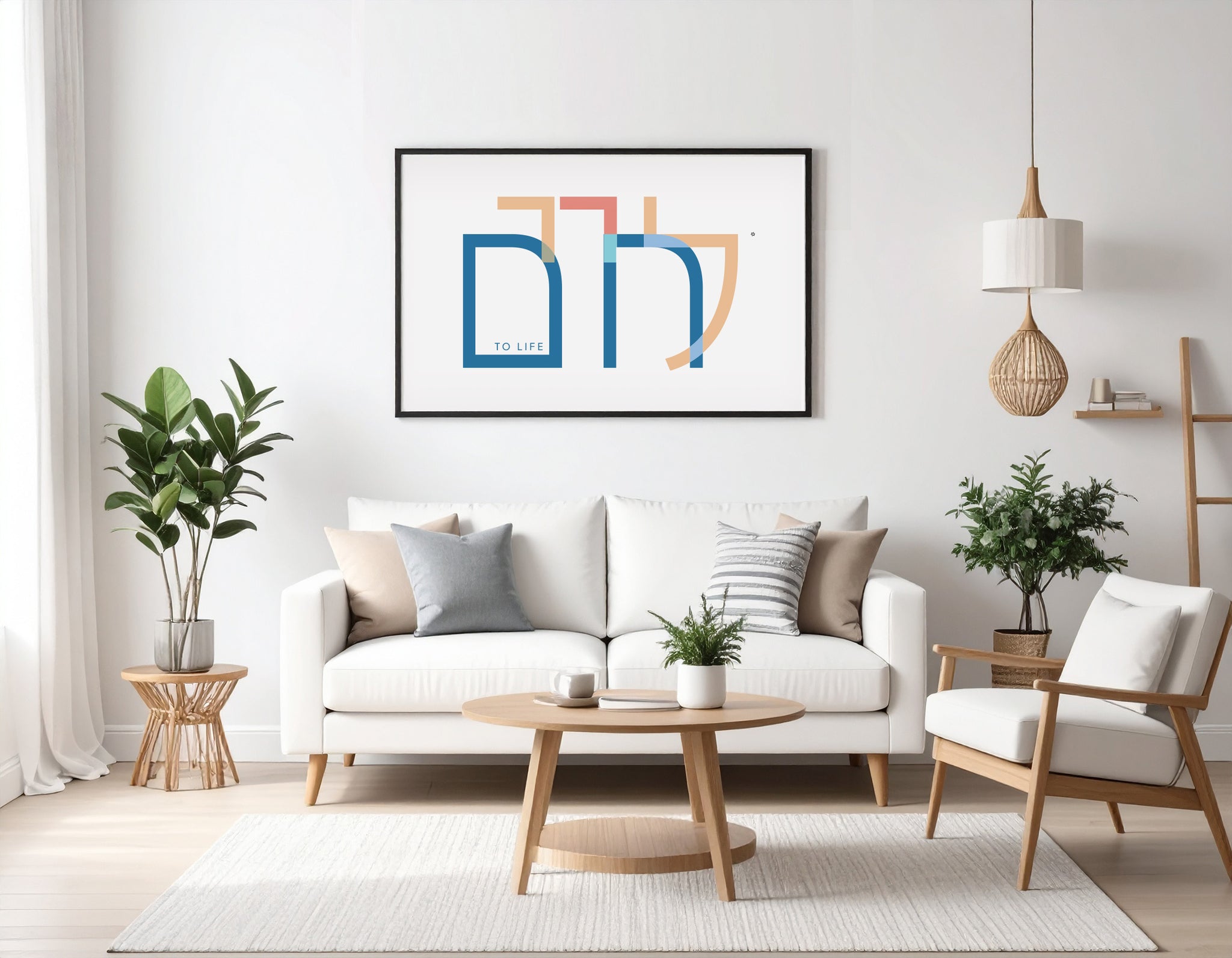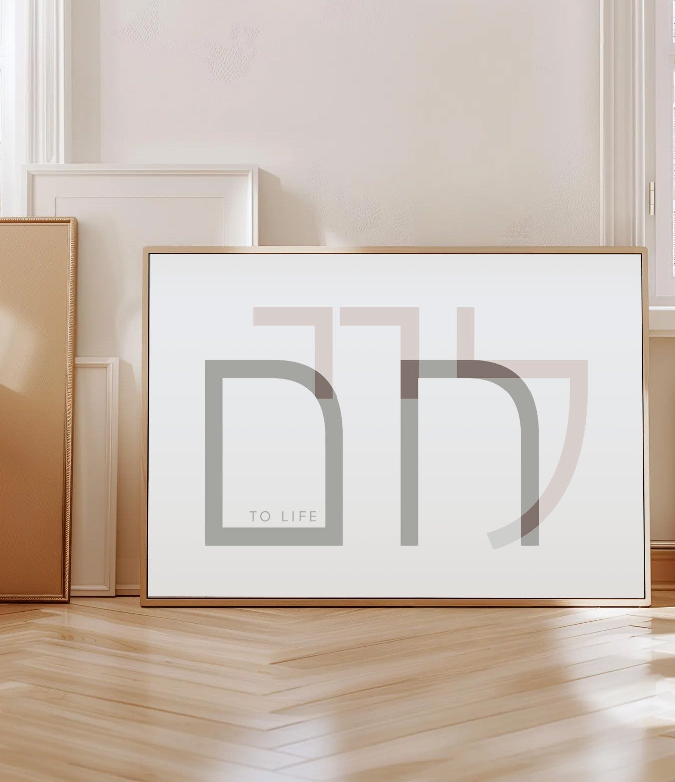 This custom 'L’Chaim' print blends bold typography style with minimalist elegance. Perfect for any home decor. This Jewish blessing brings joy and great energy. Designed exclusively by artist and designer Leila Eisenstein, it’s a truly original piece that brings a beautiful touch to your space.